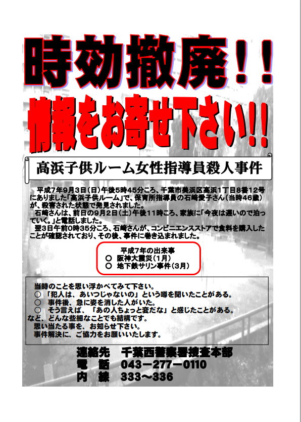 事件は1995年9月3日夕、保育所内で首を絞められ殺害された石崎さんが発見された。情報提供は千葉西署、電話043(277)0110。