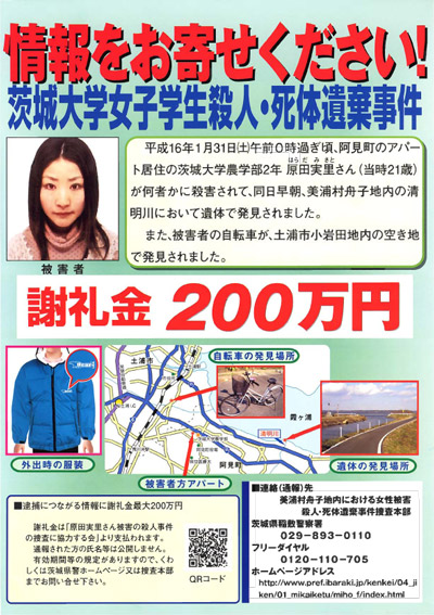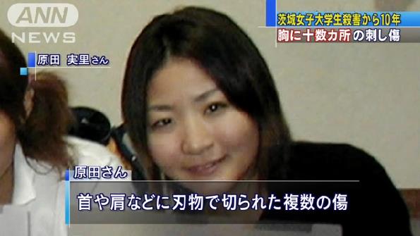 名前:原田実里さん(当時21歳) 身長:165cm 視力:0.1 居住地:茨城県稲敷郡阿見町 本籍:山口県 学校:茨城大学農学部生物生産科学科2年(トライアスロンサークル所属) 遺留品:血液が付着した被害者のジャージ(下/黒色)、自転車(自宅から約2.5km離れた土浦市内の空き地で発見)関連動画