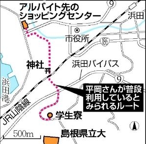 平岡都さん 身長147cm、細身で髪はセミロング、やや茶色の毛。香川県坂出市出身。2009年春に高松商業高を卒業して、島根県立大に入学。海外留学の希望を抱く明るい性格で、将来の夢は「英語を使える仕事に就く」こと。途上国の飢餓を救うボランティアサークルに所属していた。授業の欠席はほとんどなく、まじめで成績は優秀だった。連休や盆休みには必ず実家に帰省し、家族と触れ合っていた。交友範囲は大学の語学クラスやゼミ、サークル、バイト先などに限られ、メールや電話でやり取りする相手も比較的少なかった。特定の交際相手はいなかったという。事件発覚前後の足取り