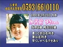1991年3月15日の午後2時30分ころ、三重県四日市市豊田在住の加茂前芳行さんの三女『加茂前ゆきちゃん』が自宅を出たまま行方不明になった。 加茂前さん宅は両親と3人の子供の5人暮らしで、 父、芳行さんは車の板金工場勤務、母市子さんはパート勤務。 3人の子供はいずれも女の子で、高校生の長女、小学6年生の次女、失踪したゆきちゃんは三女で小学2年生(当時8歳)だった。 当時学校は卒業シーズンで、通常よりも帰宅が早くなっており、ゆきちゃんが友達と別れて帰宅したのは、午後2時頃だった。 母・市子さんはパートに出ており、板金工場で夜勤の仕事をしていた父・芳行さんも、夜勤明けで寝ていた。 普段からゆきちゃんは父親を起こさないように、家に帰ると物音をたてなかったので芳行さんは帰宅にきづかなかった。 午後2時半に市子さんがパート先から自宅に電話を入れる。この時ゆきちゃんが電話に出て「今日夜勤で遅くなる」「わかった」と会話。 その後、小学6年生の次女が帰ってきたが、既にゆきちゃんの姿はなく、テーブルに上にはまだ暖かいココアが残されていた。 ゆきちゃんはココアが好きで、よく自分で作って飲んでいた。 午後4時頃、芳行さんが起床。ゆきちゃんの姿はなかったが、友達と遊びに行ったものだと思い、特に気にしなかった。 やがて長女や市子さんも帰宅する。しかし、ゆきちゃんは夜になっても帰宅しなかった。 家族や小学校の教師らと近所を探すも見つからず、午後8時には警察に捜索願を提出。捜査状況